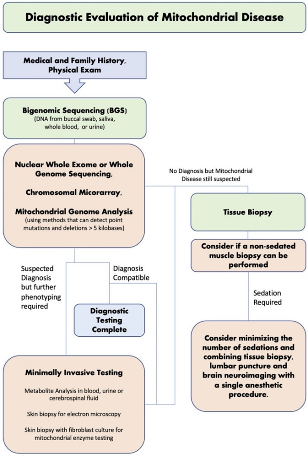 - Parikh S, Goldstein A, Koenig MK, et al. Diagnosis and management of mitochondrial disease: a consensus statement from the Mitochondrial Medicine Society. Genetics in medicine : official journal of the American College of Medical Genetics. Sep 2015;17(9):689-701. doi:10.1038/gim.2014.177