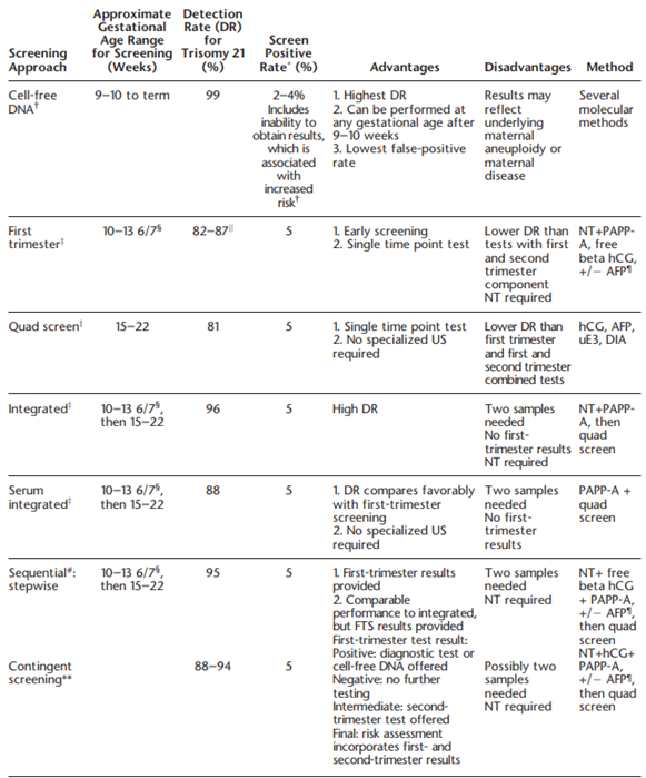 - First (11 – 14 weeks) and second (15 – 22 weeks) trimester sequential screening incorporating maternal serum markers (PAPP-A, hCG with NT) and quad maternal serum markers (hCG, AFP, uE3, DIA with NT).